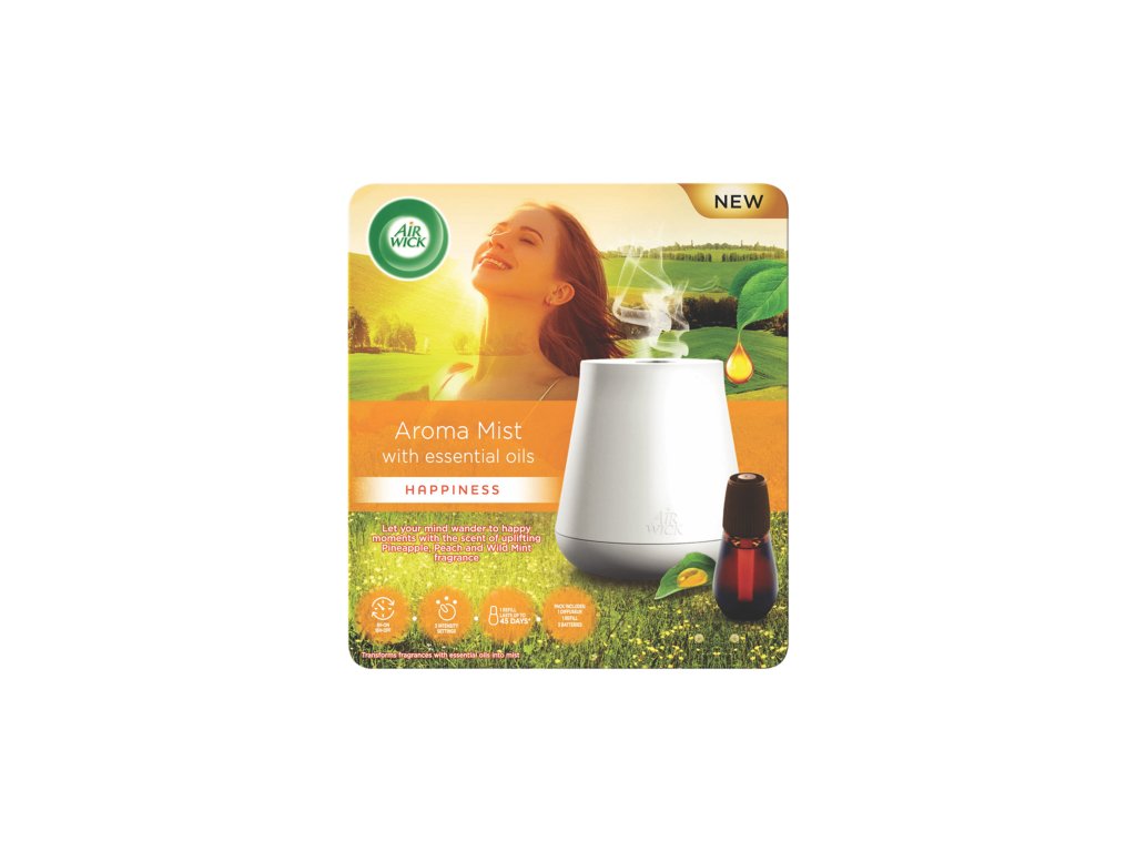 Air Wick Aroma Vaporizér s náplňou Happiness 20 ml. Elektrický difuzér s esenciálnymi olejmi pre príjemnú atmosféru domova. Prináša relax, pohodu a dlhotrvajúcu vôňu.