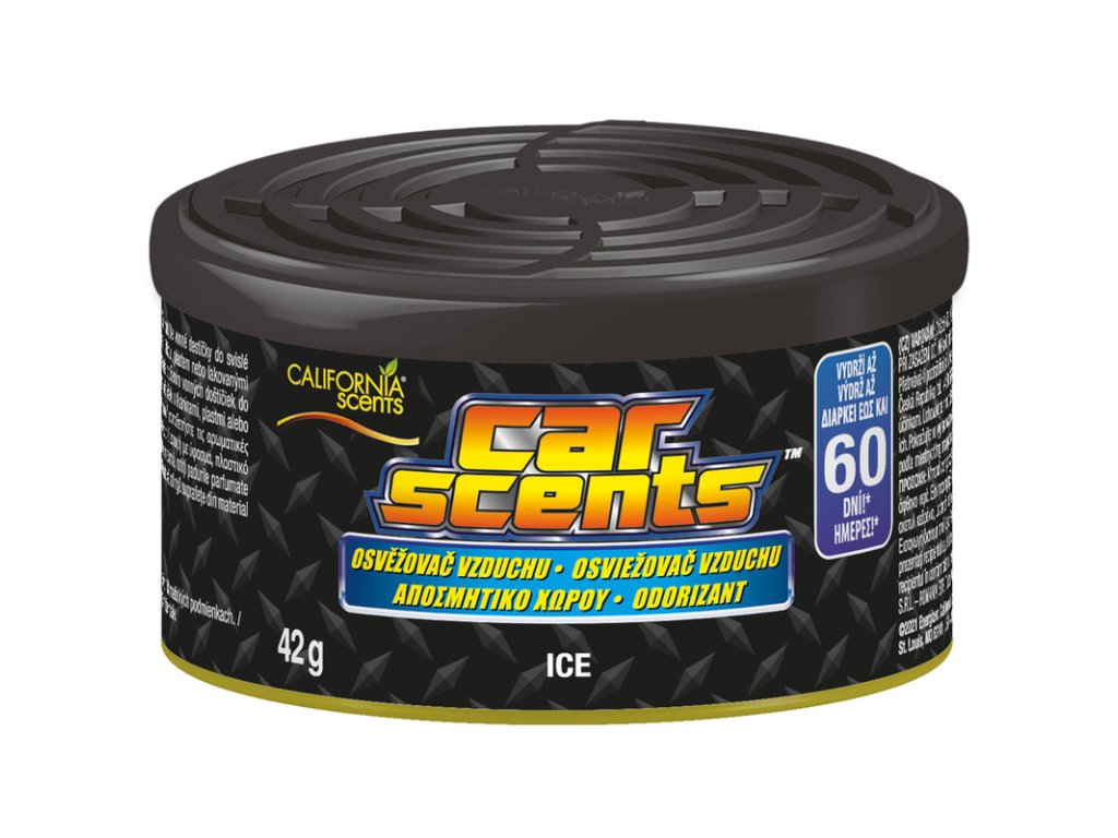 Vôňa do auta California Scents Ice vás okúzli svojou jedinečnou, zmyselnou vôňou ľadovej sviežosti. Originálny americký osviežovač vzduchu s pevnou náplňou, v praktickej, malej plechovke, ktorý prevonia Vaše auto, byt aj kanceláriu. Súčasťou plechovky je taktiež plastové viečko s regulátorom, ktorým môžete jednoducho meniť intenzitu vône. V neposlednom rade treba spomenúť, že tieto produkty California Scents sú veľmi šetrné k životnému prostrediu. Obal je tvorený recyklovateľným hliníkom a obsah je potom vďaka svojmu prírodnému pôvodu plne biologicky odbúrateľný.