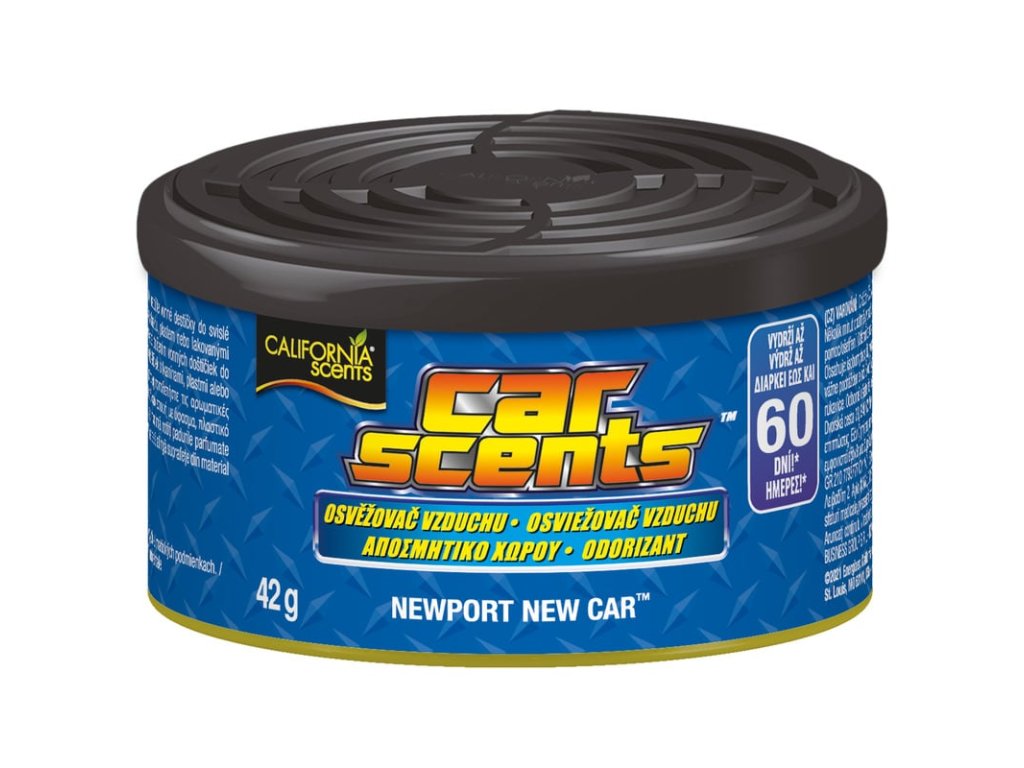 Vôňa do auta California Scents Newport New Car vás okúzli svojou jedinečnou vôňou nového auta. Originálny americký osviežovač vzduchu s pevnou náplňou, v praktickej, malej plechovke, ktorý prevonia Vaše auto, byt aj kanceláriu. Súčasťou plechovky je taktiež plastové viečko s regulátorom, ktorým môžete jednoducho meniť intenzitu vône. V neposlednom rade treba spomenúť, že tieto produkty California Scents sú veľmi šetrné k životnému prostrediu. Obal je tvorený recyklovateľným hliníkom a obsah je potom vďaka svojmu prírodnému pôvodu plne biologicky odbúrateľný.