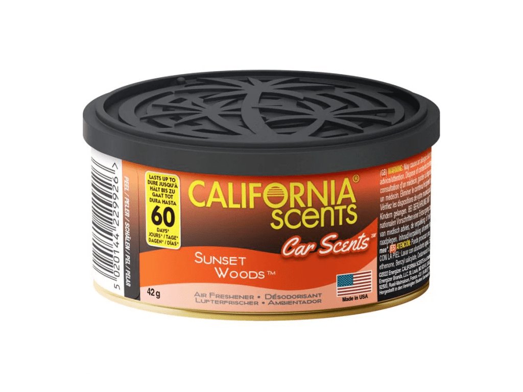 Vôňa do auta California Scents Sunset Woods Vás okúzli svojou jedinečnou drevitou vôňou. Originálny americký osviežovač vzduchu s pevnou náplňou, v praktickej, malej plechovke, ktorý prevonia Vaše auto, byt aj kanceláriu. Súčasťou plechovky je taktiež plastové viečko s regulátorom, ktorým môžete jednoducho meniť intenzitu vône. V neposlednom rade treba spomenúť, že tieto produkty California Scents sú veľmi šetrné k životnému prostrediu. Obal je tvorený recyklovateľným hliníkom a obsah je potom vďaka svojmu prírodnému pôvodu plne biologicky odbúrateľný.
