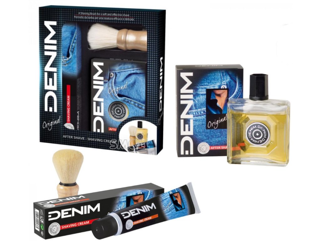 Denim Original set: voda po holení 100 ml, krém na holenie 100 ml a štetka. Klasická mužná vôňa a kompletná starostlivosť o pleť po holení.