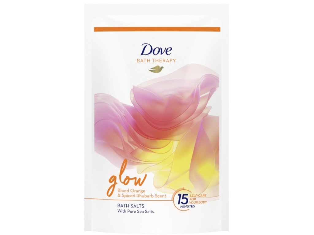 Dove Bath Therapy Glow soľ do kúpeľa 400 g. Energizujúca vôňa krvavého pomaranča a rebarbory.