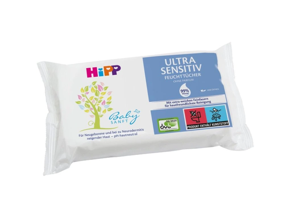 HiPP Baby Sanft Ošetrujúce obrúsky ULTRA-SENSITIVE sú vyrobené z vlákien s mimoriadne tenkou štruktúrou. Vďaka nej sú ešte mäkšie a umožňujú čo najjemnejšie čistenie. Sú mimoriadne šetrné k pokožke. Sú napustené jemným mliekom, ktoré obsahuje prírodný extrakt z organických mandlí a vytvorené tak, aby sa minimalizovalo riziko alergií. Sú bez parafínu, vonných látok, parabénov, silikónov, éterických olejov, alkoholu, pšeničných proteínov mydla, farbív, fenoxyetinolu a surovín živočíšneho pôvodu. Vyznačujú sa pH neutrálnym pre pokožku. Bielené bez použitia chlóru.