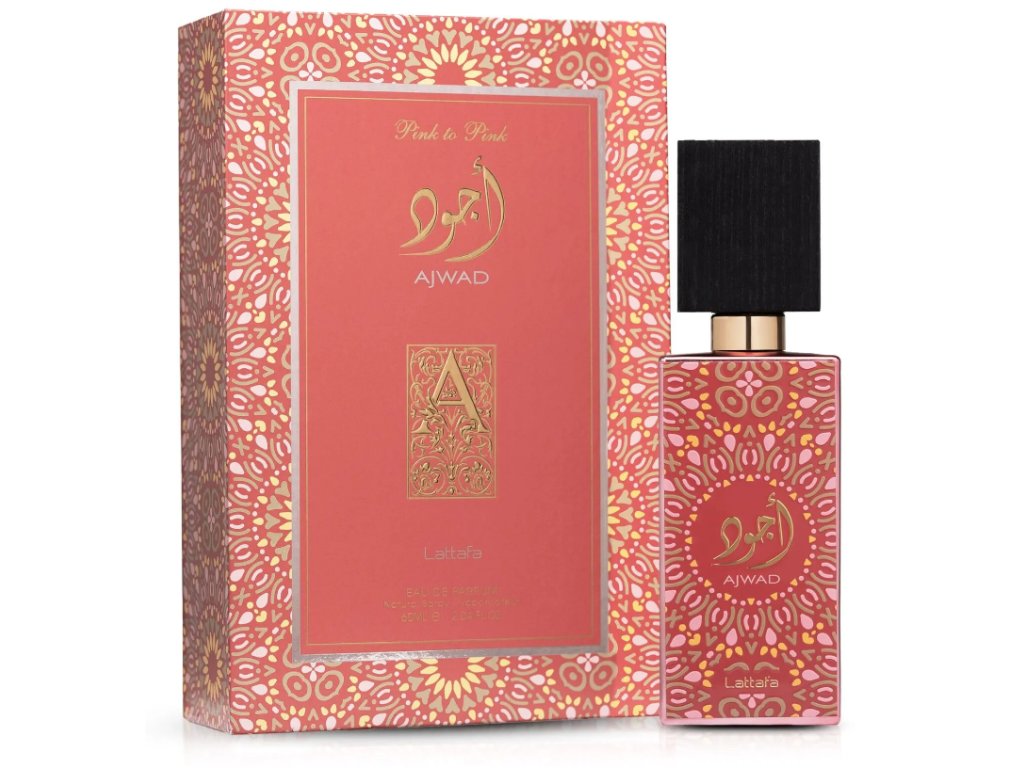 Lattafa Ajwad Pink To Pink je unisex parfémová voda s ovocno-kvetinovým srdcom, kde rozkvitne guava, ružový grapefruít a liči, podčiarknuté romantickým ružovým jazmínom a pivonkami, zakončené jemným koženým a drevitým akordom.