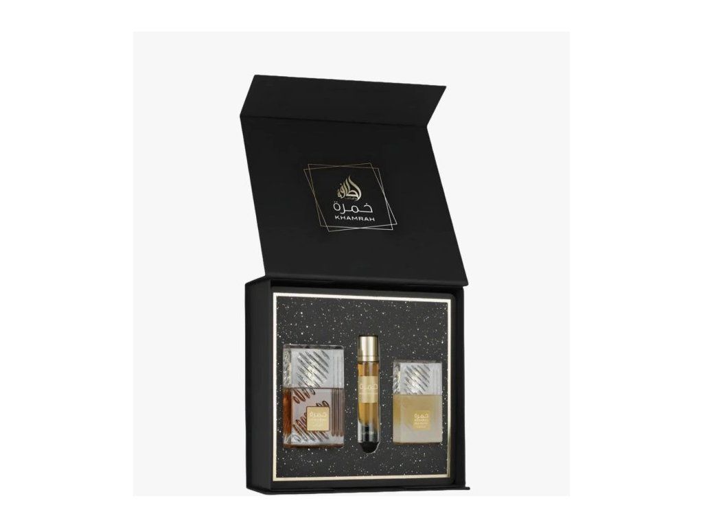 Lattafa Khamrah darčekový set obsahuje 100 ml Eau De Parfum, 12 ml cestovný parfum a 50 ml vlasový parfum. Luxusná orientálno-gurmánska vôňa s tónmi škorice, vanilky a pralinky.