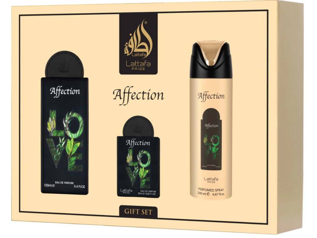 Lattafa Pride Affection darčekový set. Luxusná ovocno-kvetinová vôňa s jemne sladkým drevitým základom. Obsahuje parfumovú vodu 100 ml, cestovné balenie 20 ml a parfumovaný sprej 200 ml.