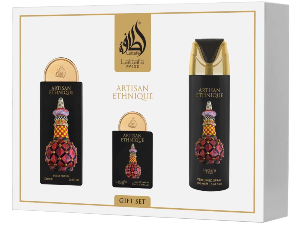 Lattafa Pride Artisan Ethnique darčekový set. Unisex vôňa s bohatým orientálno-drevito-korenistým charakterom. Obsahuje parfumovú vodu 100 ml, cestovné balenie 20 ml a parfumovaný sprej 200 ml.