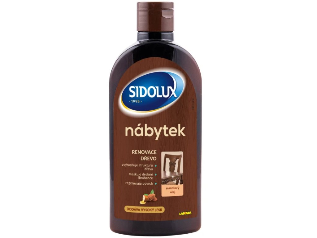 Sidolux renovačné mlieko na nábytok s mandľovým olejom je praktický prípravok na domácu starostlivosť o drevo, dyhu a laminát. Navrátenie strateného lesku, ľahká aplikácia a príjemná mandľová vôňa z neho robia ideálnu voľbu pre pravidelné ošetrenie nábytku v obývačke, spálni aj jedálni.
